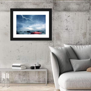 This abstract canvas art features a dramatic scene of umbrellas in a stormy setting. A striking red umbrella contrasts beautifully against a backdrop of dark umbrellas and a turbulent sky. It's a perfect piece for any modern décor that needs a touch of intensity.