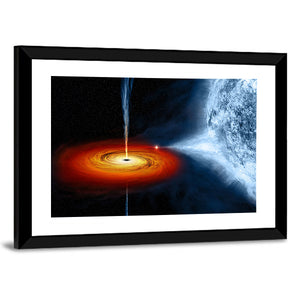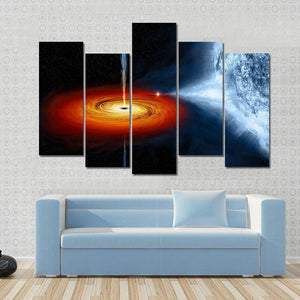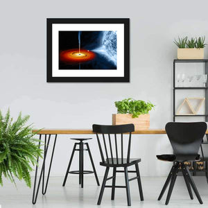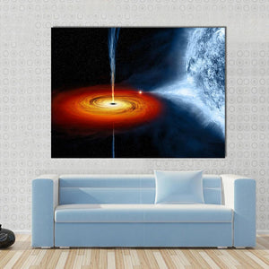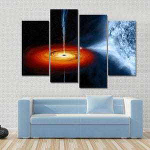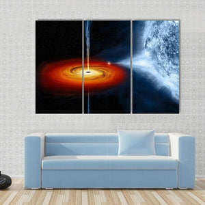 This canvas wall art captures the dramatic scene of a black hole sucking in a big white dwarf, featuring a glowing accretion disk and distant stars. The cosmic palette of black, orange, and blue evokes a sense of awe and wonder, making it a striking addition to your modern decor.