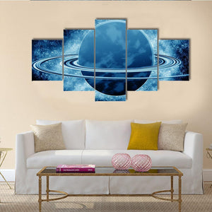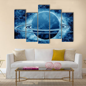 A centered blue planet with thin, layered rings and visible clouds floats in a deep nebula, giving the piece a calm, mysterious, cosmic feel. Blue, white, and black tones add depth and an abstract, modern character. It suits room decor in modern house interiors looking for a serene space theme.