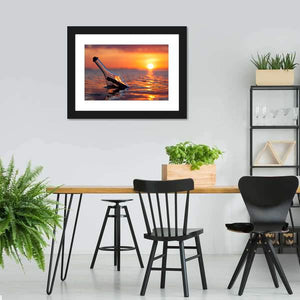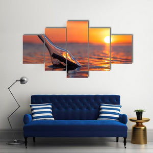 Bottle In Sea Canvas Wall Art depicts a glass bottle with a rolled-up message floating on a sunset sea. Warm oranges and yellows meet deep blues in a modern, rule-of-thirds landscape that feels hopeful, serene, and suited to modern home decor.
