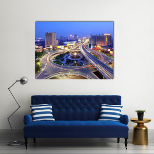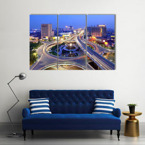 This canvas wall art features a vibrant city skyline of Nanchang, showcasing an aerial view filled with energy and modernity. The colorful palette of blue, orange, and white captures the dynamic feel of an urban landscape.