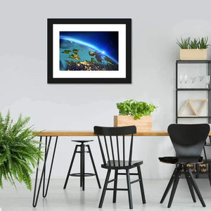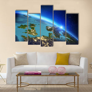 This canvas shows Earth from space, focused on Europe at night with the United Kingdom and Ireland visible. City lights, a setting sun on the horizon, and stars in the background create a vast, illuminated, cosmic mood that suits modern house and room decor.