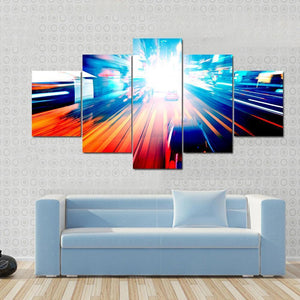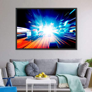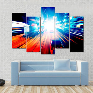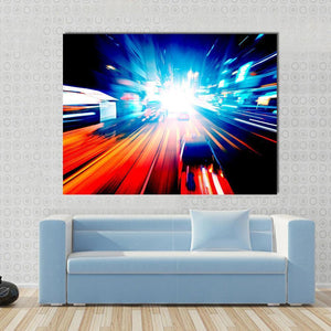 This vibrant canvas artwork captures the dynamic motion of city lights and traffic under the night sky. With streaking headlights and a rich palette of blue, orange, and red, it adds an energetic touch to any space.
