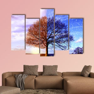 This captivating artwork features a tree split into two distinct halves, showcasing vibrant autumn colors and a serene winter scene. The dramatic contrasts between warm oranges and cool blues evoke a sense of seasonal change, making it a striking addition to your décor.