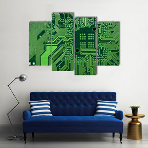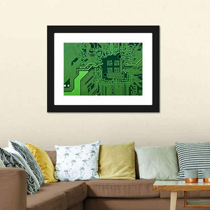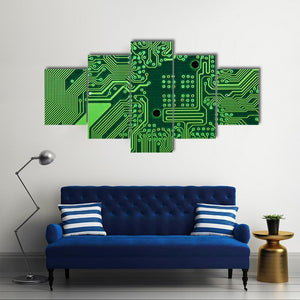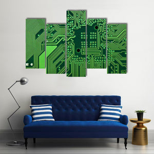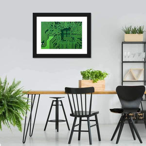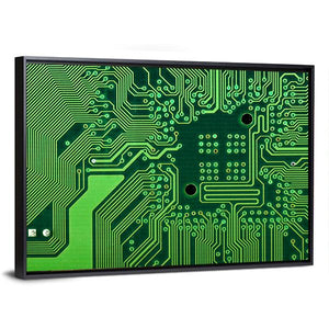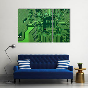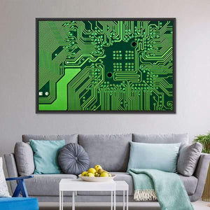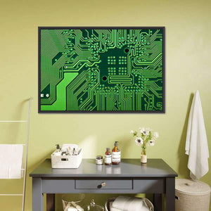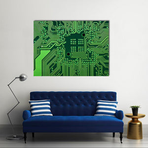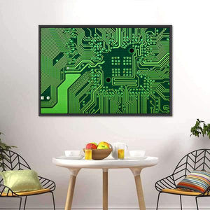 This canvas shows a close-up of a circuit board with dense networks of lines and circles, rendered in green and black. Its abstract, modern industrial look feels technical and organized, a good fit for modern homes or science-themed rooms.