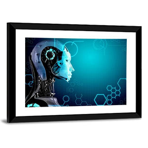 A close-up profile of a computer robot head shows a transparent shell with inner workings and glowing blue circuitry. The modern, abstract digital composition—layered with hexagonal shapes in blue, black, white, and silver—creates a futuristic, technological mood that suits modern home or office decor.