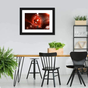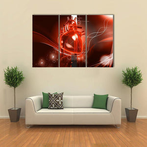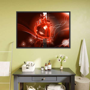 An anatomical heart takes center stage in this digital medical illustration, glowing in red against an abstract swirling background. The centered, symmetrical composition pairs white swirling lines with black accents for a vibrant, scientific mood. It works well in contemporary homes or medical offices that favor modern, science-inspired decor.