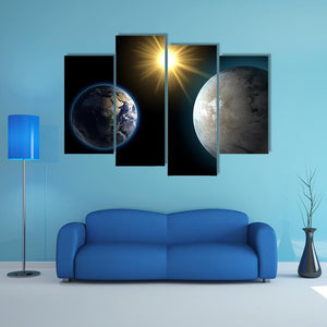 This canvas art captures the beauty of the solar system, featuring the sun, earth, and moon in a stunning cosmic scene. With its serene colors of blue, yellow, and grey, it adds a calming yet awe-inspiring touch to any space.
