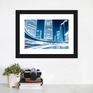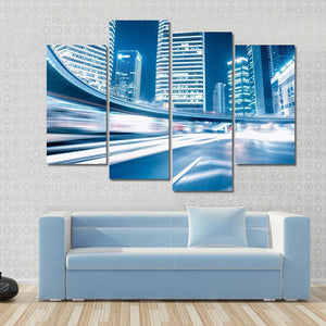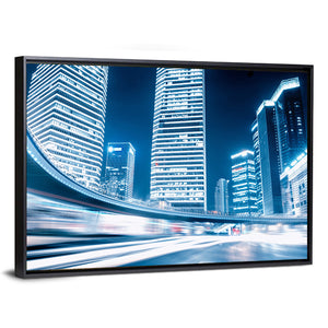 This canvas art captures the dynamic energy of a city at night, featuring streaks of light from fast-moving cars amidst towering skyscrapers. It's a modern piece perfect for adding a lively touch to your space.