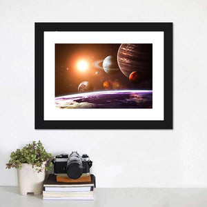 This canvas features a breathtaking portrayal of the solar system, with planets, a glowing sun, and a majestic nebula. The cosmic palette of orange, purple, and deep blue evokes a sense of awe and vastness, making it a striking addition to any space.