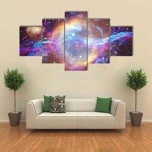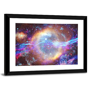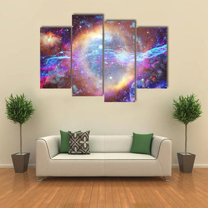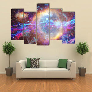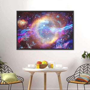 A vibrant galaxy and nebula scene featuring swirling gases, a bright core, and star clusters that suggest deep cosmic motion. Purple, blue, orange, pink, and yellow tones create a vivid, awe-inspiring atmosphere. The modern, abstract composition makes a bold wall art choice for contemporary homes and room decor.
