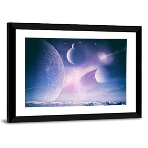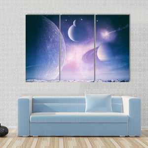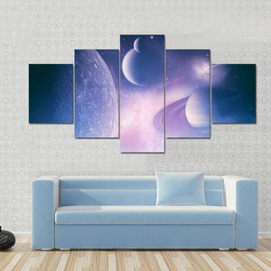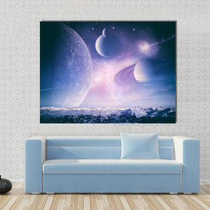 This abstract canvas art immerses you in a cosmic landscape filled with space, planets, and majestic mountains. The rich palette of blues, purples, and pinks evokes a sense of awe, making it a striking addition to any modern wall decor.