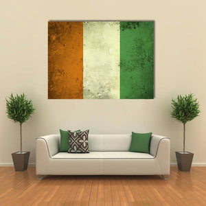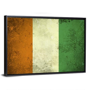 A grungy, textured take on the Ivory Coast flag, shown as vertical orange, beige and green stripes with a distressed finish. This abstract, vintage-modern canvas print emphasizes a worn, textured mood and suits house settings and room decor with modern or vintage styles.