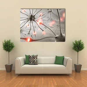 Hardwired Neurons Canvas Wall Art presents a close-up study of neurons, brain cells, and synapses in an abstract, modern digital style. The gray-and-white composition is punctuated by glowing red synapses and detailed neural structures, creating a scientific, energetic, and complex atmosphere. It works well in modern home interiors, study areas, and medical or science-themed spaces.