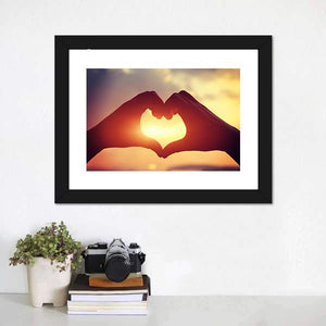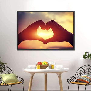 This romantic canvas features silhouetted hands forming a heart shape against a stunning sunset. The blend of orange, yellow, and pink hues creates a peaceful and hopeful atmosphere, perfect for wall decor in any loving space.