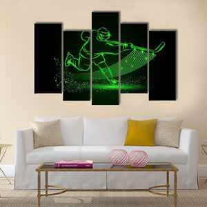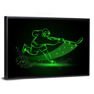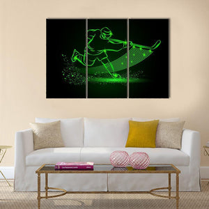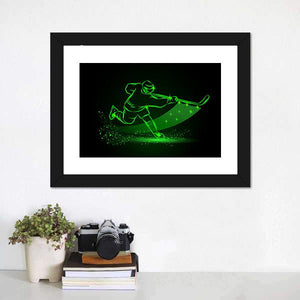 Neon Hockey Player Canvas shows an action shot of a hockey player with an energetic, dynamic mood. Glowing green and black neon lines and a particle-spray effect create an abstract, modern look that suits contemporary living spaces and sports-themed rooms.