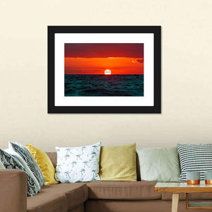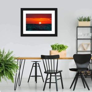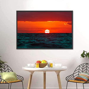 Hot Sunset Over Baltic Sea presents an ocean sunset with the sun partially obscured by clouds. Warm oranges and reds meet dark blue and teal for a dramatic, serene, and vibrant look that pairs well with modern homes and room decor.