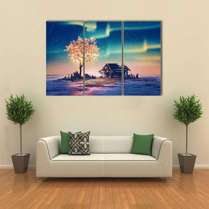 This landscape artwork features a glowing tree and a dilapidated cabin under the serene aurora borealis. The dreamy blend of blue, pink, and yellow creates a peaceful atmosphere, perfect for nature lovers.
