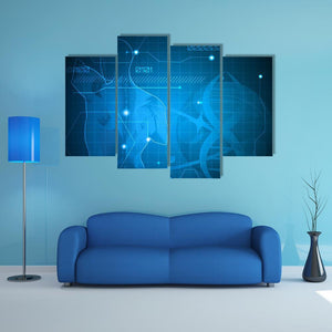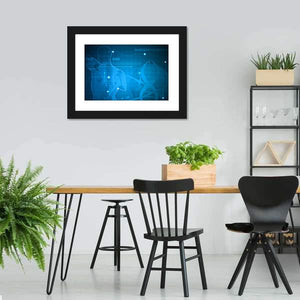 Spine & Gene Chain Canvas shows a human silhouette intertwined with a DNA strand, layered with lines of binary code and medical-diagram elements to set a scientific, modern tone. A grid overlay, hexagonal patterns and glowing highlights add a technological, futuristic edge in blue, black and white. Suits modern homes, home offices, and science-themed rooms seeking abstract digital artwork.