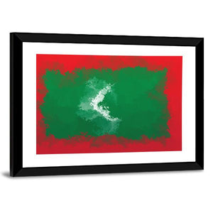 A bold, graphic abstract take on the Maldives flag featuring a centered crescent moon in red, green, and white with visible brushstroke texture and a grunge edge. The modern, graphic look suits contemporary homes and works well in living rooms, entryways, or modern offices.
