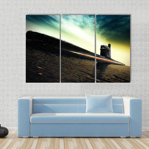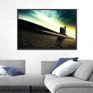 This striking canvas captures a submarine navigating through dark blue waters under a dramatic sky. The use of yellow and orange accents adds intensity to the powerful scene, making it a commanding piece for your space.
