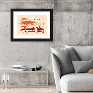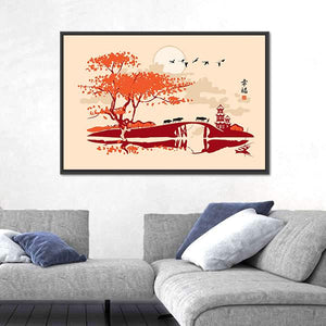 This canvas wall art captures a serene landscape at sunset, featuring a graceful bridge, silhouetted trees, and birds in flight. The peaceful atmosphere and traditional style make it a fitting choice for calming spaces.