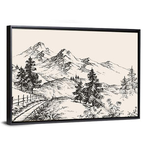 This canvas art captures serene mountains, gentle pine trees, and a winding path. With its hand-drawn style and cross-hatching shading, it adds a peaceful ambiance, perfect for any nature lover's space.
