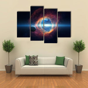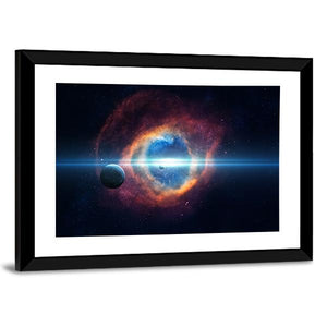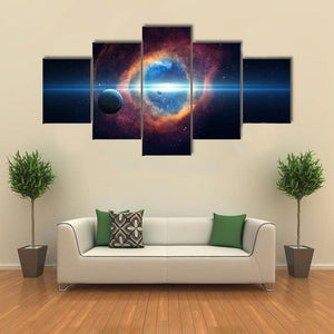 Swirling colorful nebula, two planets and a glowing blue light beam set a cosmic, mysterious tone in this Beauty Of Space canvas. The modern, abstract composition uses depth and the rule of thirds to hold the eye and suits contemporary rooms and modern decor.