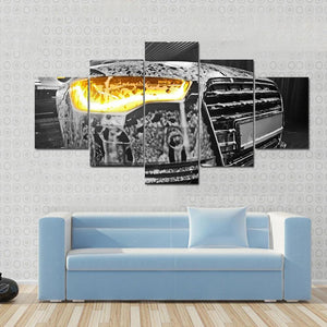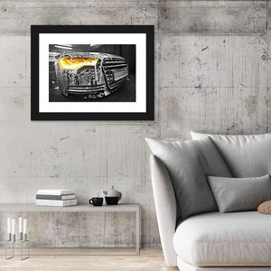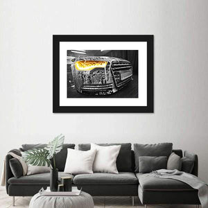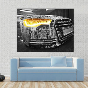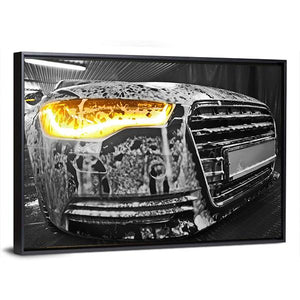 This canvas art showcases a close-up perspective of a pristine black car, detailed with soap suds and highlighted by warm yellow light. The dynamic and clean aesthetic makes it a striking piece for modern decor.