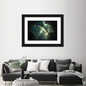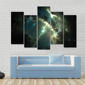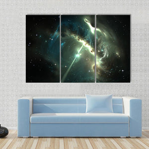 This abstract canvas art features a nebula with stars and a galaxy, evoking a cosmic and mysterious atmosphere. The rich palette of blues, greens, and golds creates depth and a sense of vastness, making it a unique addition to your wall décor.