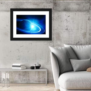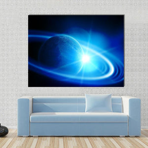 This captivating canvas features a breathtaking depiction of Saturn, showcasing its stunning rings and glowing star amidst a cosmic backdrop. With a palette of blue, white, and black, it brings an awe-inspiring touch to any space.