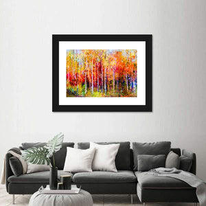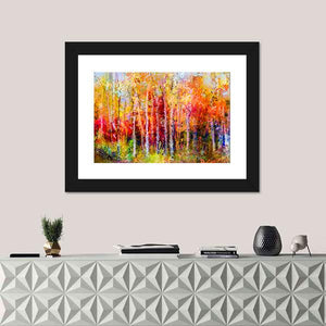 This vibrant canvas artwork captures the essence of a forest during fall, featuring trees adorned in rich hues of orange, red, yellow, green, and blue. Its layered, impressionistic style brings warmth and energy to any space.
