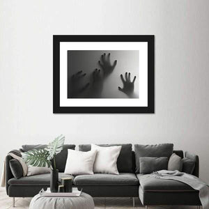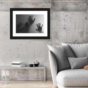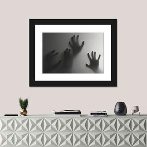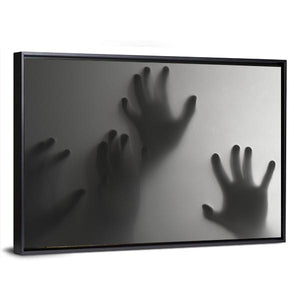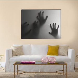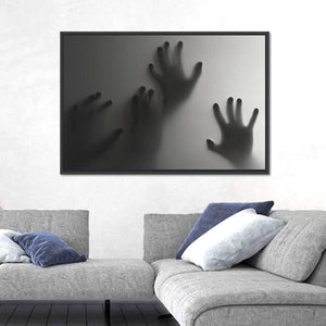 Silhouette Of A Hand Canvas Wall Art depicts silhouetted hands pressed against a frosted surface in a palette of gray, white and black. The abstract, modern composition uses depth and negative space to create an eerie, mysterious, haunting atmosphere. Suited to modern or horror-themed room decor and other moody spaces.