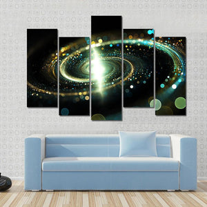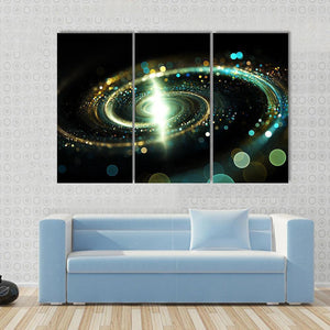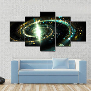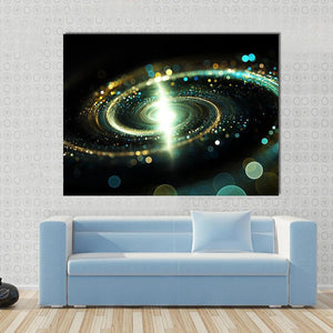 This abstract canvas wall art portrays a mesmerizing galaxy, featuring swirling vortexes and a radiant center amidst a cosmic backdrop. The ethereal colors of black, gold, teal, white, and blue create a mysterious atmosphere, making it a captivating choice for modern decor.