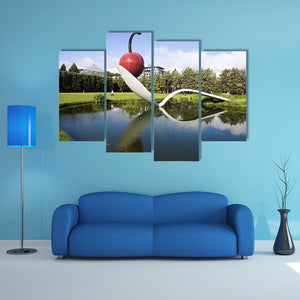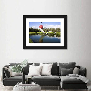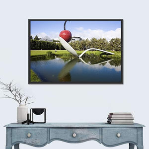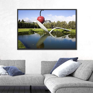 This captivating canvas art features the iconic Spoonbridge and Cherry sculpture set in a serene park landscape. Its modern style and vibrant palette of blue, green, and red inspire a bright, artistic atmosphere.