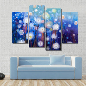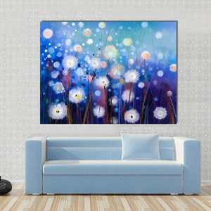 This abstract canvas art features dreamy dandelions and glowing seed pods in beautiful shades of blue, purple, and pink. Perfect for adding a touch of nature’s serenity to any space.
