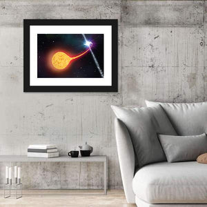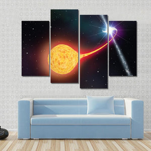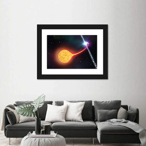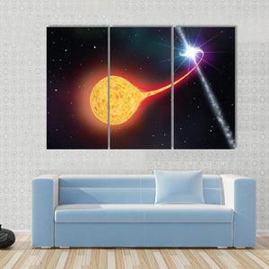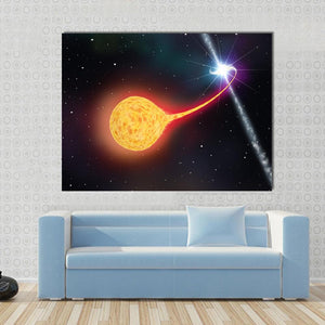 This captivating canvas artwork captures a dynamic cosmic event, featuring a luminous star and a swirling gaseous stream. Its vibrant palette of orange, yellow, blue, and purple evokes an energetic and awe-inspiring atmosphere, perfect for a modern space.