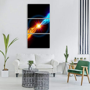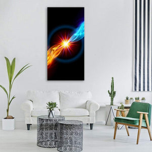 An abstract depiction of an energy collision featuring a glowing starburst at the center, blue and orange wisps of light, and a circular blue glow set against a dark background. Its symmetrical composition and dynamic, cosmic mood work well in modern and contemporary wall decor.