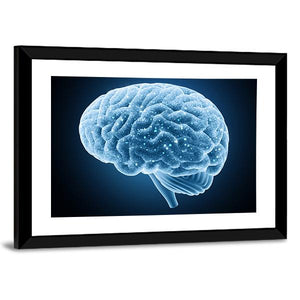 A centered, glowing brain rendered in blue and black with bright white highlights that suggest neural activity. The modern, abstract piece reads scientific and futuristic, making it a strong choice for modern home and room decor.