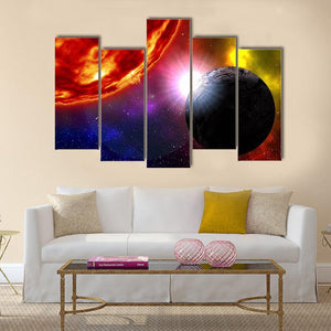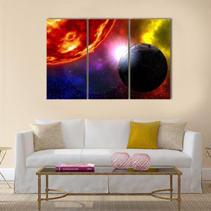 A glowing sun rises over a textured dark planet set against a colorful nebula and distant galaxy, giving the piece a cosmic, vibrant mood. The abstract, modern composition uses depth and the rule of thirds to draw the eye, making it well suited for modern home or room decor.