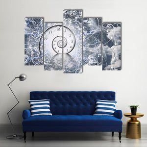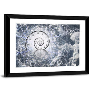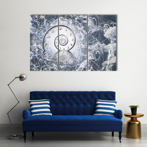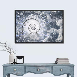 An abstract canvas that blends a spiral clock face, swirling patterns, and cloud-like forms to suggest time and space. The blue, white, gray, and black palette creates a mysterious, surreal, cosmic mood that suits modern interiors and science-inspired rooms.