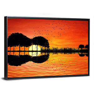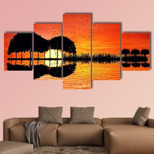 Trees form the silhouette of a guitar against a warm orange and yellow sunset, with birds overhead and a clear reflection in the water. The symmetrical, modern landscape carries a serene, reflective mood and fits modern home and room decor.
