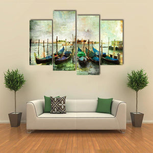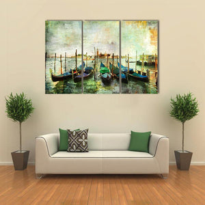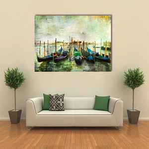 This canvas art captures the serene beauty of gondolas gliding along a tranquil canal in Venice. The painterly effect and rich colors create a vintage atmosphere that complements any landscape decor.