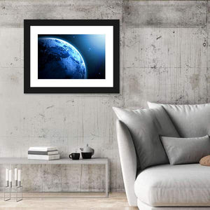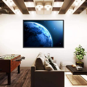 This captivating canvas art features a breathtaking view of Earth from space, showcasing the planet's clouds and oceans. The photorealistic style and deep blue and black palette evoke a vast and serene atmosphere, making it a perfect focal point for any room.