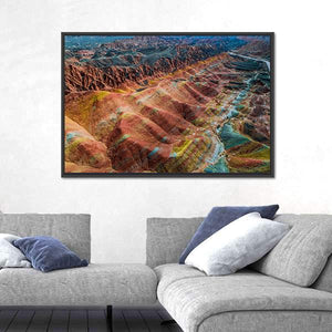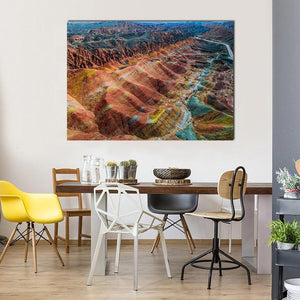 This canvas art features a breathtaking aerial view of colorful mountains and winding canyons, showcasing dramatic contrasts and layered terrain. The vibrant palette of red, orange, yellow, blue, and green creates an awe-inspiring scene that adds a majestic touch to any space.