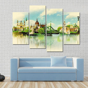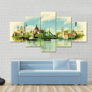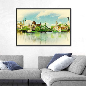 This canvas art captures a serene view of Budapest, featuring the iconic Parliament building and Liberty Bridge reflected in the Danube river. Its soft brushstrokes in calming blues and greens create a picturesque atmosphere that brings charm to any space.