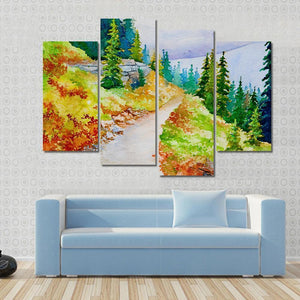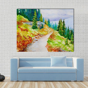 This canvas wall art captures a winding mountain path bordered by evergreen trees and a rocky outcrop. With a serene palette of greens, oranges, and blues, it creates a peaceful atmosphere, perfect for enhancing your living space.
