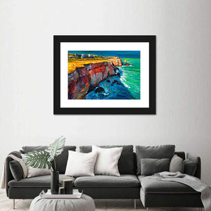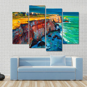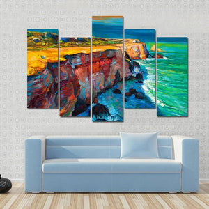This canvas wall art features a vibrant watercolor depiction of coastal cliffs and ocean waves. With its dramatic palette of blues, greens, and warm colors, it adds a lively touch to any wall, capturing the beauty of nature with thick brushstrokes and textured paint.