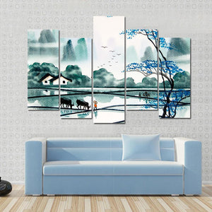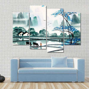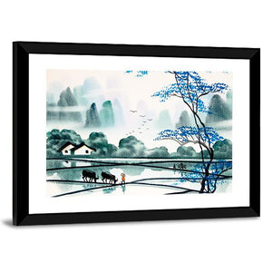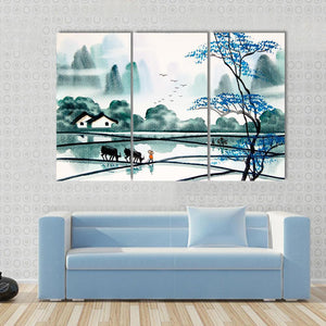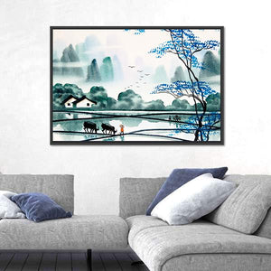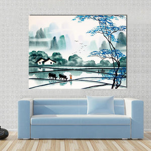 This canvas wall art features a serene landscape scene of a peaceful village, showcasing rice paddies, two black buffalo, and distant misty mountains. The tranquil mood is enhanced by a soft palette of blue, green, and grey, making it a lovely addition to any room.