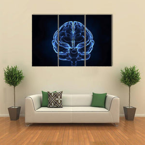 This canvas print presents an x-ray view of the human brain, with glowing blue outlines and detailed gyri and sulci that emphasize a symmetrical, scientific appearance. The blue, black, and white palette creates an analytical, intricate mood and works well in modern interiors, home offices, or medical and science-themed spaces.